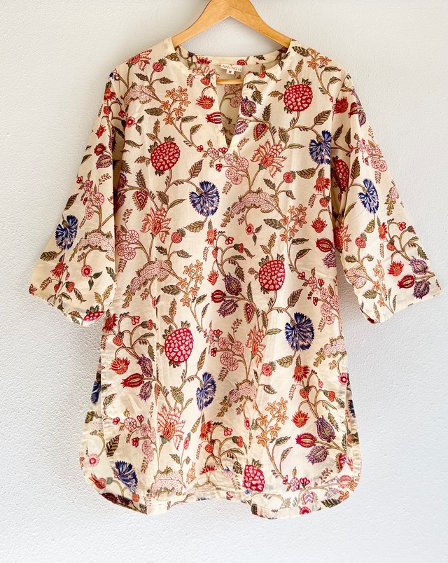 こちらはA・I様売約済みの商品となります。 誠に恐れ入りますが、他の方はご購入いただけませんのでご了承願います。 ANOKHIの半袖ワンピースです。 ビビットな配色と格子模様のボタニカルデザインが華やかで可愛いです。 どこか南国を思わせるトロピカルな雰囲気で、リゾートにも良さそうです。 ANOKHIの商品名はナイティなので、ルームウェアやパジャマとして着用するのもいいですね。 両サイドにポケットが付いています。 1点のみの入荷です。 【サイズ】S 着丈:約119cm、肩幅:約36cm、 バスト(脇の下から脇の下):約111cm、 袖丈:約13cm、スリット:約25cm 【素材】コットン100% 【MADE IN INDIA】 ┈┈┈┈┈┈┈┈┈┈┈ ❁ ❁ ❁ ┈┈┈┈┈┈┈┈┈┈┈ 【ANOKHI製品について】 年々値上がりしているANOKHIですが、異常気象によるコットンの生産量低下や、ウクライナ危機などによるコットン価格の高騰により、今季商品価格が一気に跳ね上がりました。 店主がはじめてANOKHI製品を手にした10年程前と比べて約2倍の価格差がある印象です。 それでもやはり他のブランドにはない、質・仕立ての良さ、デザインの秀逸さが魅力なので、今後も少しずつ仕入れていけたらと思っています。 そんな事情も含めて気に入っていただけたら嬉しいです。 ■インド製品について■ ブロックプリント製品をはじめ、インドの手仕事製品は職人がいくつもの工程を手間暇かけてひとつひとつ心を込めて手作りしています。 熟練の職人でも染めムラやわずかな柄のズレ等全く無く仕上げる事は不可能と言われ、作業工程の間に染料のシミなどが付いたり、若干のほつれなど発生する場合もございます。 どれも手仕事ゆえの味わいとして受け取っていただけましたら幸いです。 機械製品にはない職人の息吹きが感じられる、あたたかみのある手仕事の魅力が届きますように。 ■ケアについて■ ブロックプリント、ダブプリントなど染め物に関しまして、染料の匂いが残っていますので、お手元に届きましたら風通しの良い場所で陰干ししていただくか、一度お洗濯されると匂いが軽減されるかと思います。 ■お洗濯について■ ANOKHI製品は色止めしてある為、ほとんど色落ちしませんが、念の為最初は単独でお洗濯される事をおすすめ致します。(洗濯機で洗えます。) ドライクリーニングは可能ですが、乾燥機は使えません。 洗剤は、中性洗剤をお使い下さい。