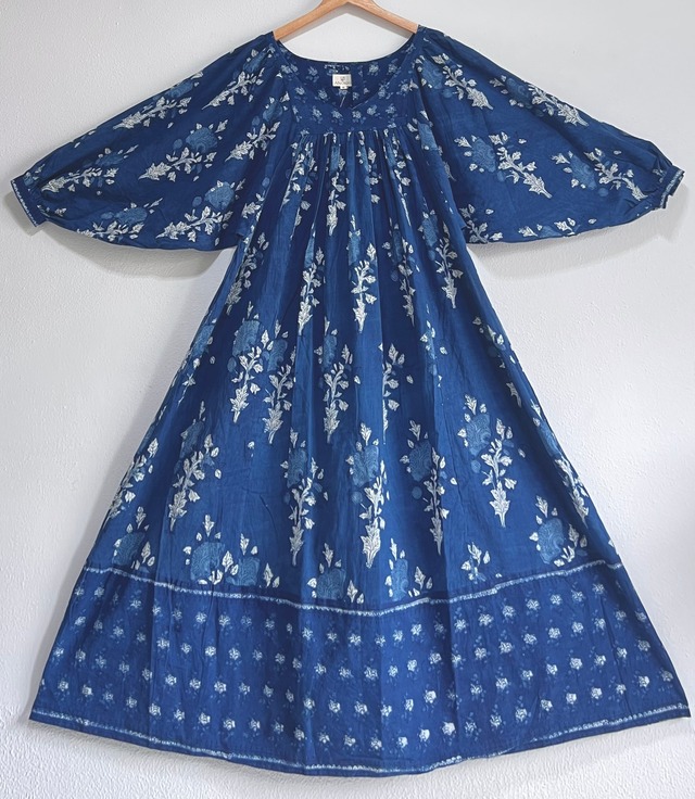 こちらはF・M様ご予約の商品となります。 誠に恐れ入りますが、他の方はご購入いただけませんのでご了承願います。 2023年5月下旬に発表されたばかりの最新コレクション、 TABRIZのドレスです。 ANOKHIのインディゴの季節。 藍の深い青、インディゴ独特の香り。 灼熱の太陽の下、風に揺らぐ青が涼を誘います。 毎年この時期にインディゴのコレクションを発表しているANOKHI。 待っていたインディゴファンの方も多いのではないでしょうか。 風を纏って涼やかに広がるバルーンスリーブとフレアスカートがゆったりとしたシルエットで、素敵なドレスです。 海辺やリゾートはもちろん、お家でのリラックスタイムにも纏っていただきたい一着です。 マタニティードレスとしてもおすすめです。 共布のベルトでウエストマークして着用可能です。(ベルト通しはありません) ※肩が広く開いているデザインの為、ある程度肩幅のある方の方がフィットしそうです。 1点のみの入荷です。 【サイズ】M 日本のLサイズ相当です。 着丈:約125cm 肩幅・バストはバルーンスリーブの為計測しておりません。 (モデル身長160cm/普段着用サイズ:L) (トルソーサイズ:9号、肩幅:38cm、バスト:82cm、ウエスト:60cm、ヒップ:86cm) 【素材】コットン100% 【MADE IN INDIA】 ┈┈┈┈┈┈┈┈┈┈┈ ❁ ❁ ❁ ┈┈┈┈┈┈┈┈┈┈┈ 【ご注意点】 インディゴ製品は余分な染料を落とす為、着用前に他の物と分けて冷水で優しく手洗いして下さい。 (こちらは洗濯機では洗えません。) 洗濯後は、直射日光を避けて陰干しして下さい。 又インディゴ製品の特性として、色の薄いインナーなどに擦れて色移りする事もございますのでご注意下さい。 【ANOKHI製品について】 年々値上がりしているANOKHIですが、異常気象によるコットンの生産量低下や、ウクライナ危機などによるコットン価格の高騰により、今季商品価格が一気に跳ね上がりました。 店主がはじめてANOKHI製品を手にした10年程前と比べて約2倍の価格差がある印象です。 それでもやはり他のブランドにはない、質・仕立ての良さ、デザインの秀逸さが魅力なので、今後も少しずつ仕入れていけたらと思っています。 そんな事情も含めて気に入っていただけたら嬉しいです。 ■インド製品について■ ブロックプリント製品をはじめ、インドの手仕事製品は職人がいくつもの工程を手間暇かけてひとつひとつ心を込めて手作りしています。 熟練の職人でも染めムラやわずかな柄のズレ等全く無く仕上げる事は不可能と言われ、作業工程の間に染料のシミなどが付いたり、若干のほつれなど発生する場合もございます。 どれも手仕事ゆえの味わいとして受け取っていただけましたら幸いです。 機械製品にはない職人の息吹きが感じられる、あたたかみのある手仕事の魅力が届きますように。