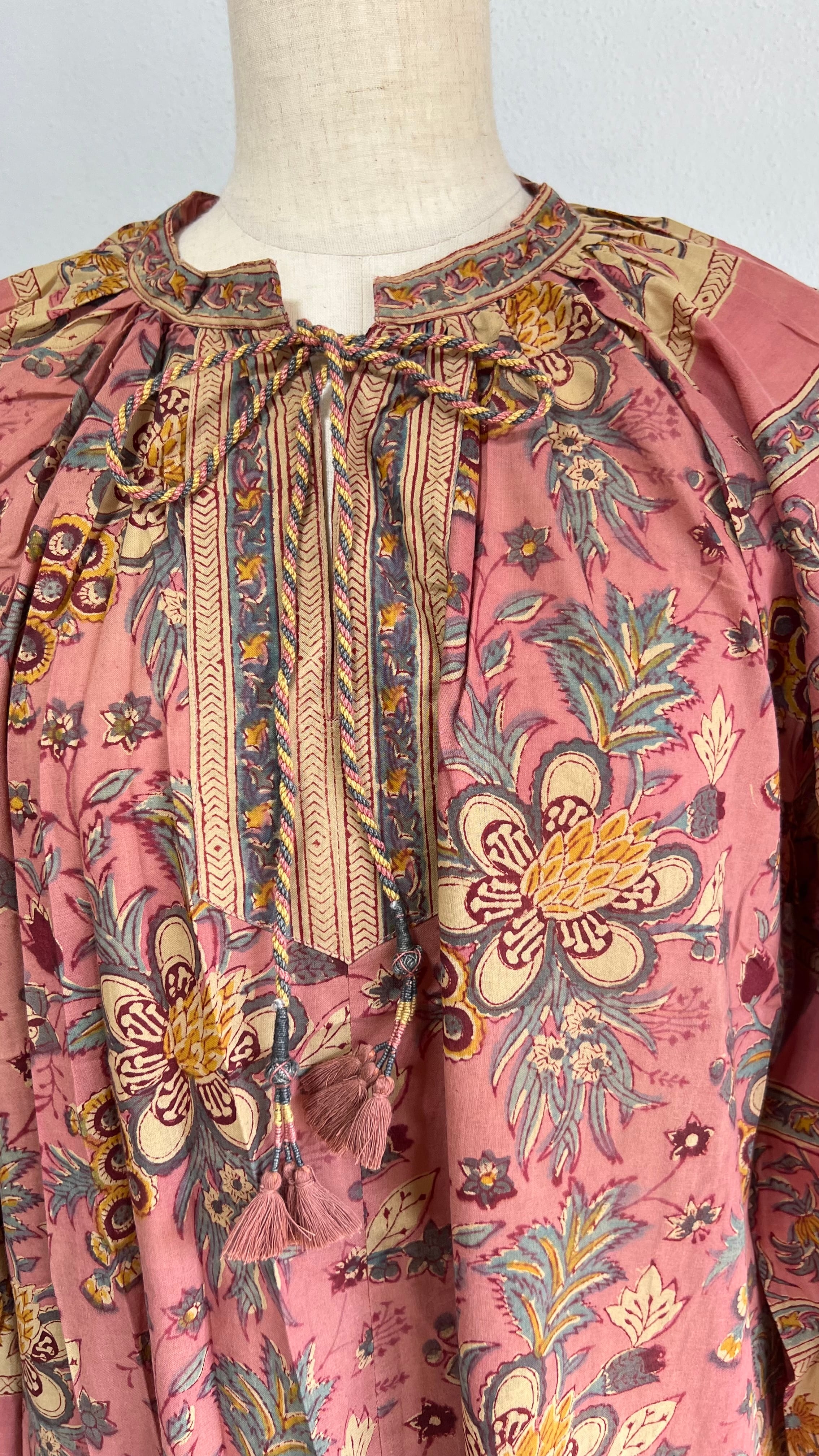 くすみ感のあるアンティークピンクの色合い、バルーンスリーブとAラインのロングドレス、足捌きの良いスリット、美しいタッセル紐。