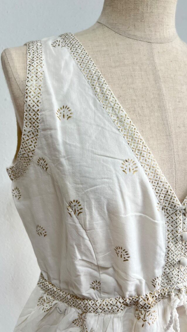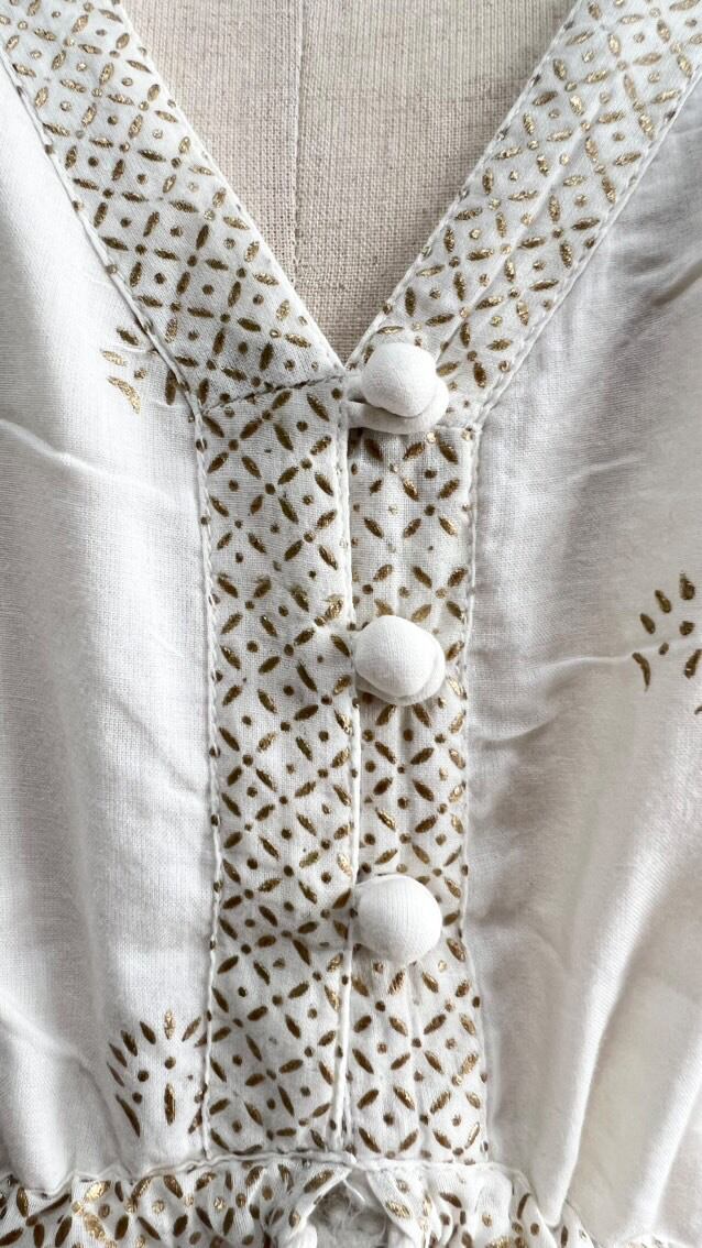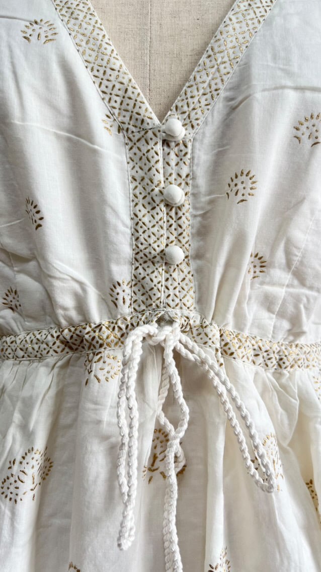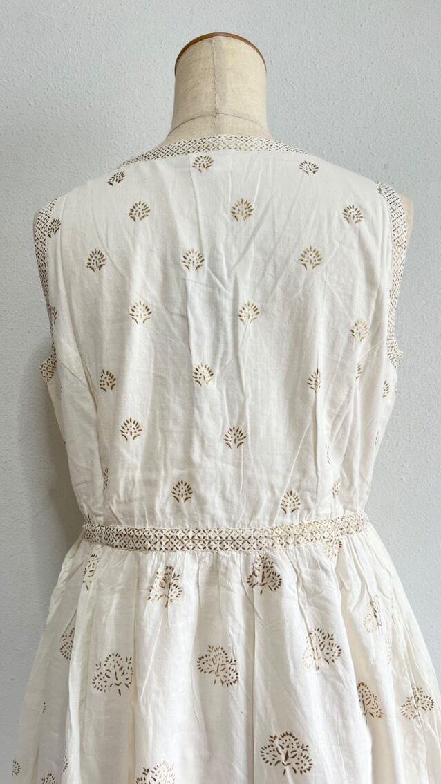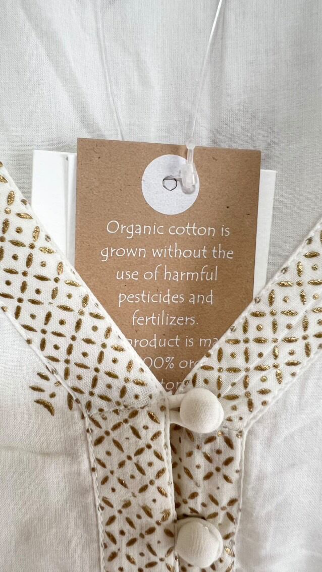 オフホワイトに金彩が施された、オーガニックコットンのメイデンドレスです。