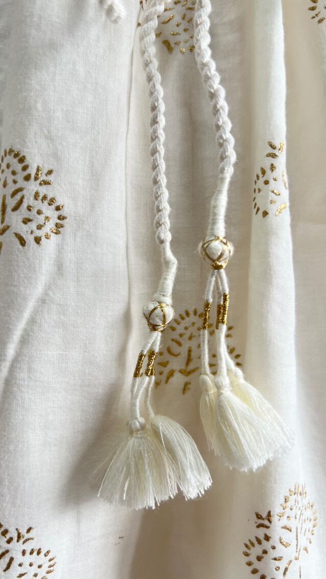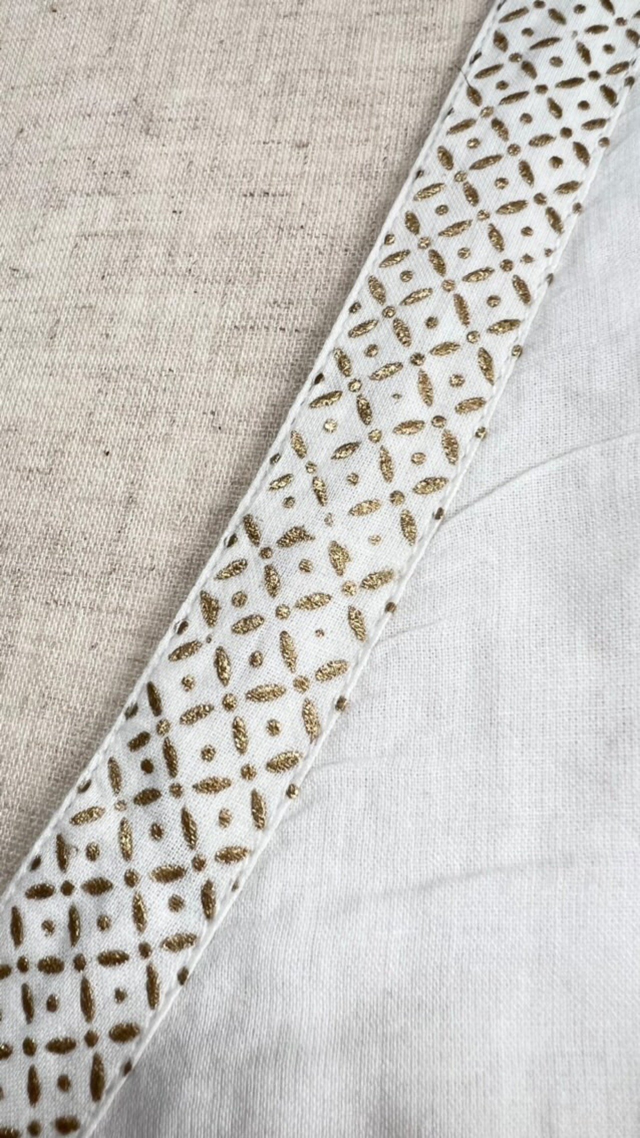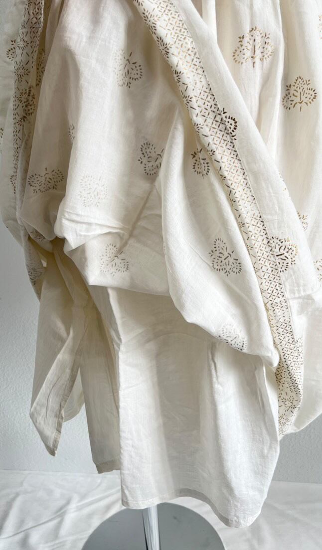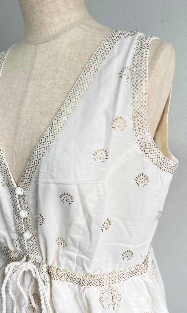 オフホワイトに金彩が施された、オーガニックコットンのメイデンドレスです。