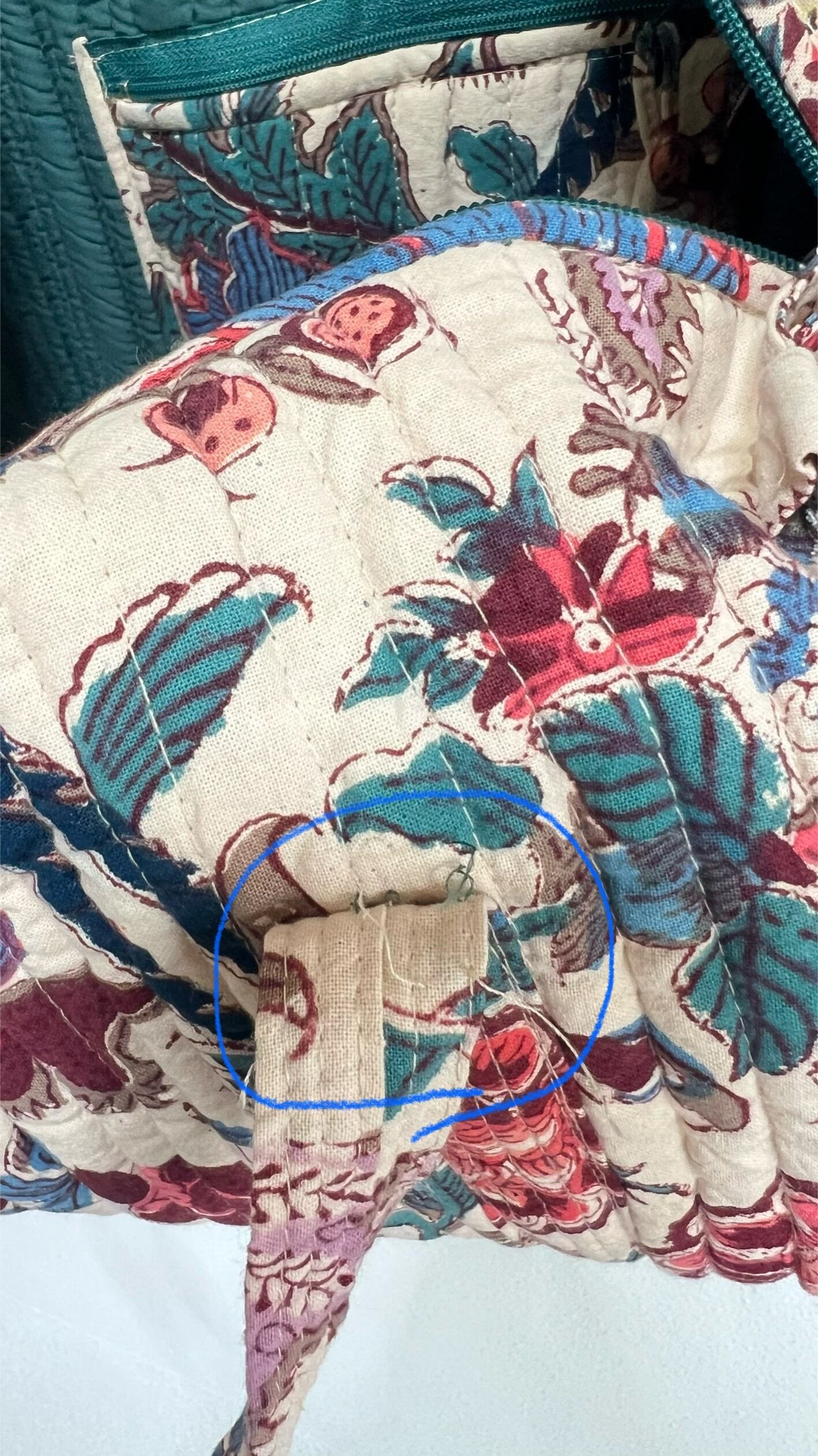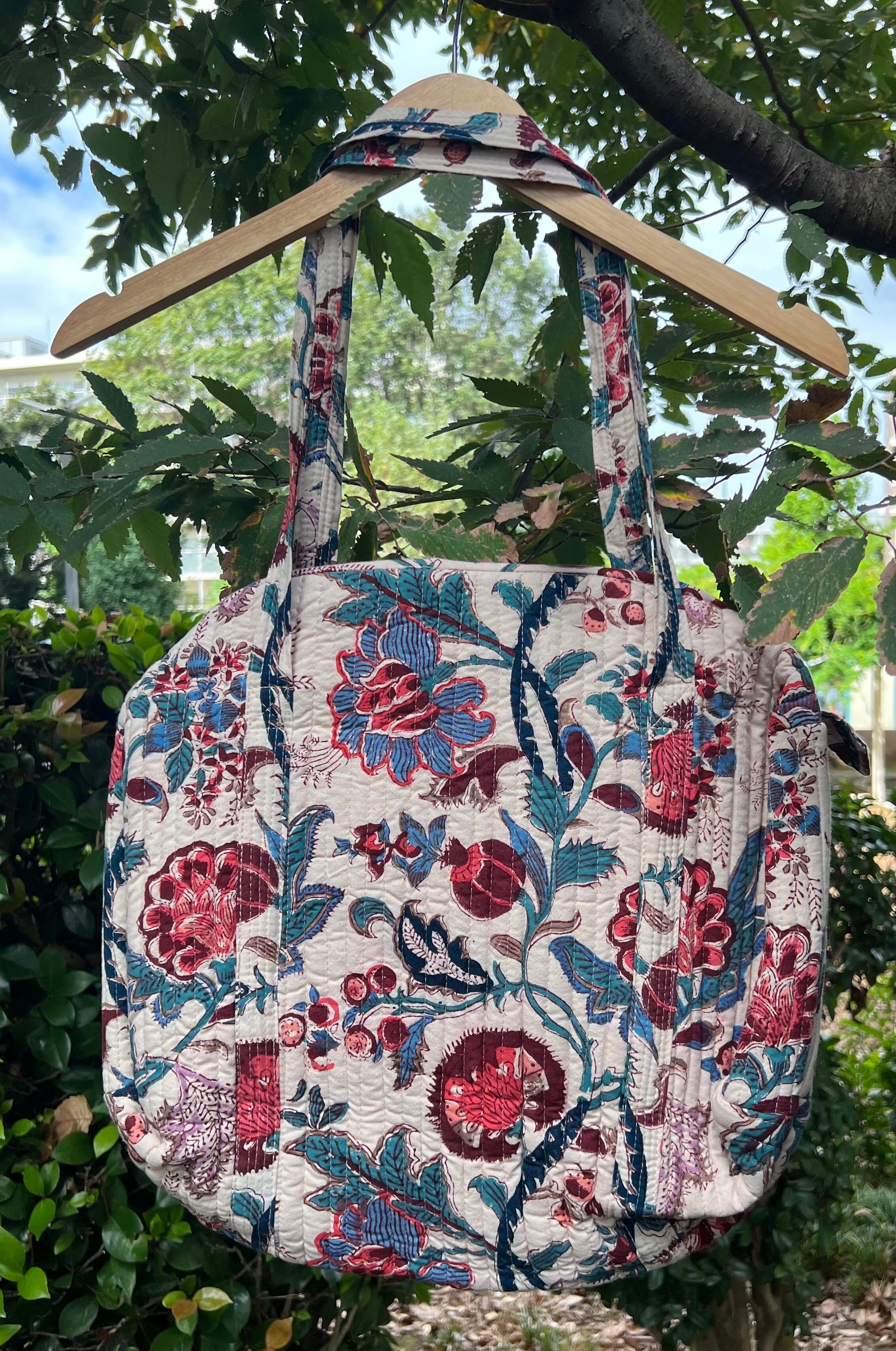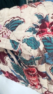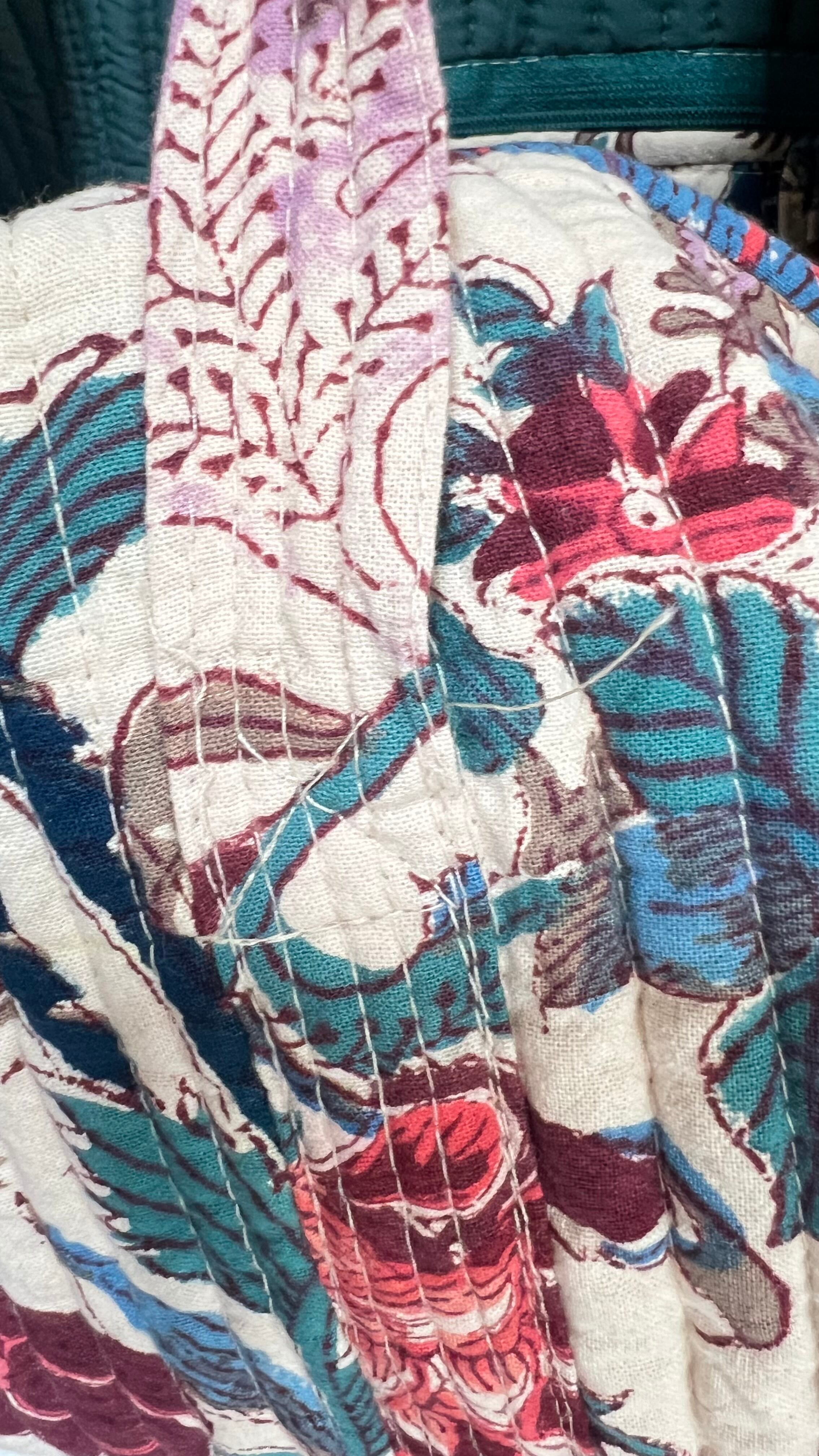 柔らかなアイボリーカラーに華やかなボタニカルデザイン、縦ステッチのキルティングが素敵です。