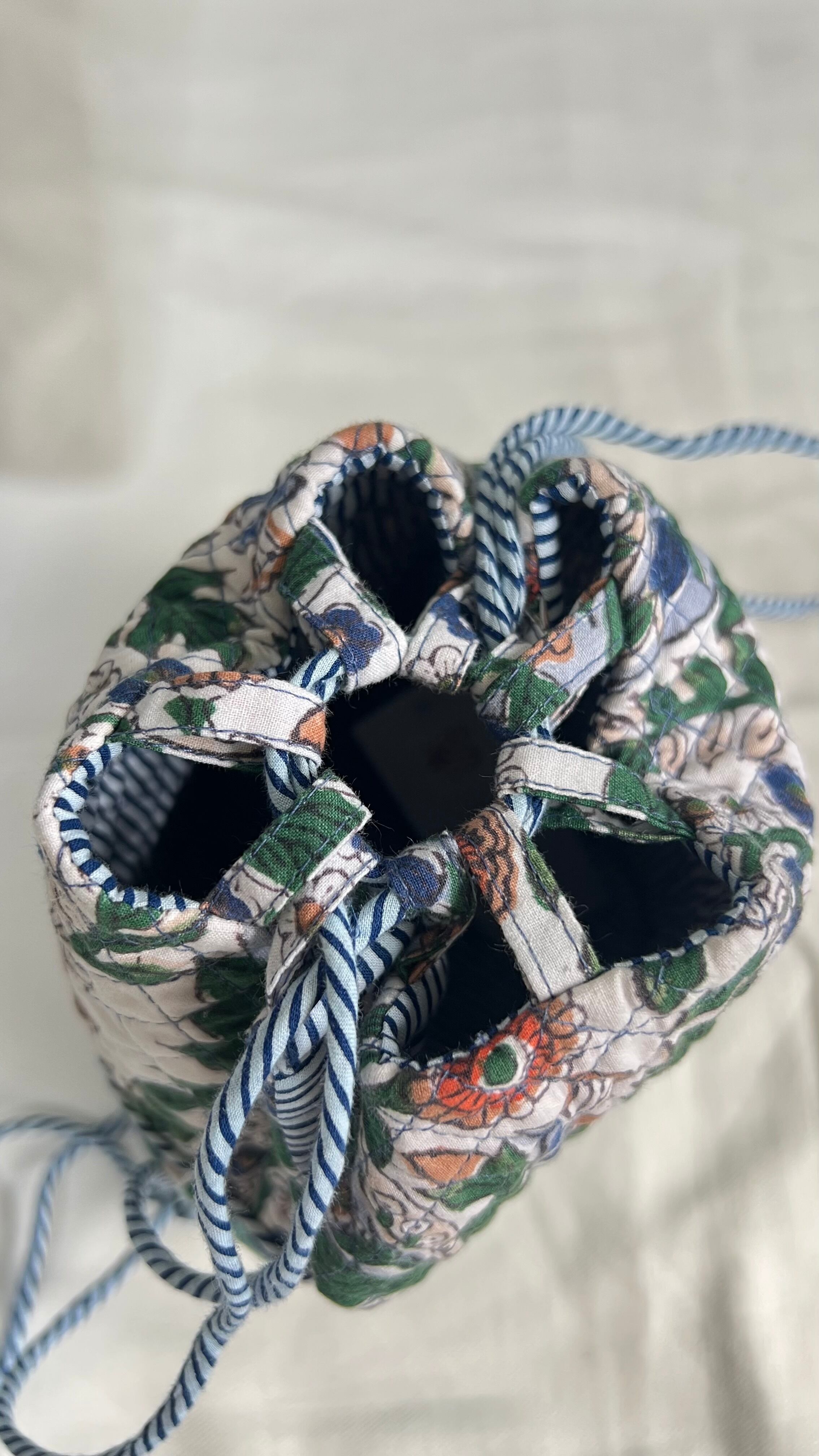 裏地には紐と同じストライプ柄を使い、全体をキルティングした後、表の下半分に別生地をあて、上下をストライプ柄でパイピングという細部まで凝った作りとなっています。