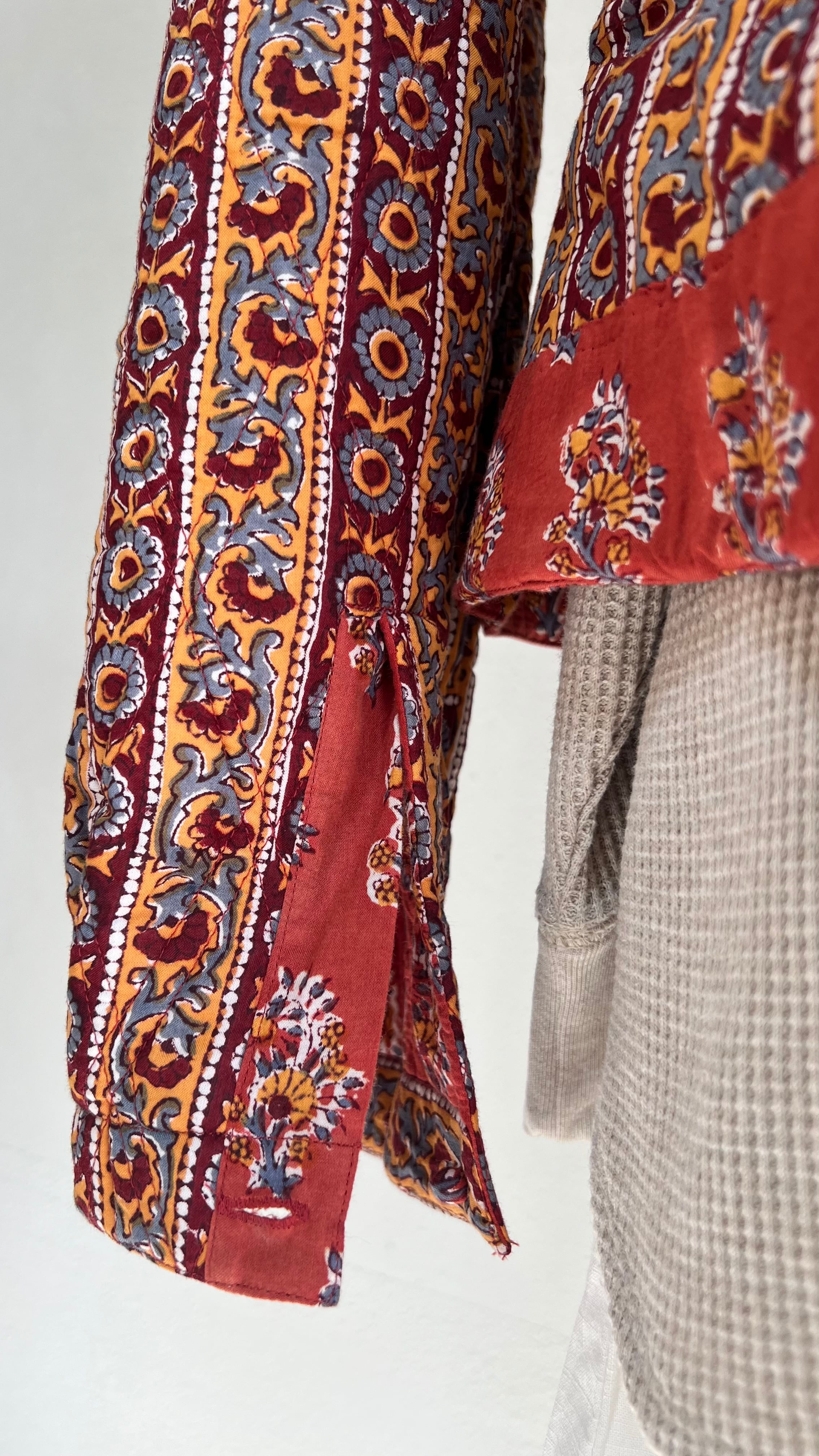 光のお祭りDiwali(ヒンドゥー暦の新月の夜に5日間行われるお祭りで、ディヤと呼ばれる素焼きの器に入ったオイルランプや色とりどりの砂で描くランゴーリで家中を飾り、街が光りで輝きます)に合わせて発表されたコレクションで、オイルランプの火やDiwaliの華やぎを象徴するような赤レンガとマルーン(栗に由来する茶色がかった深紅)の色合いと花柄のブティ(小さなモチーフの連続)が美しいコレクションとなっています。