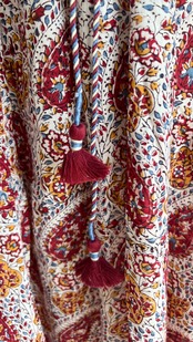 例えば、デザインは創業者のフェイス氏(女性)の娘さんが担っており、デザインがあがった後、木版職人、ハンドブロックプリント職人、染色、縫製、刺繍、キルト、タッセル職人など、たくさんの職人の手によって、協力して作り上げられていきます。全てその道の名門と言われる職人です。