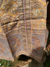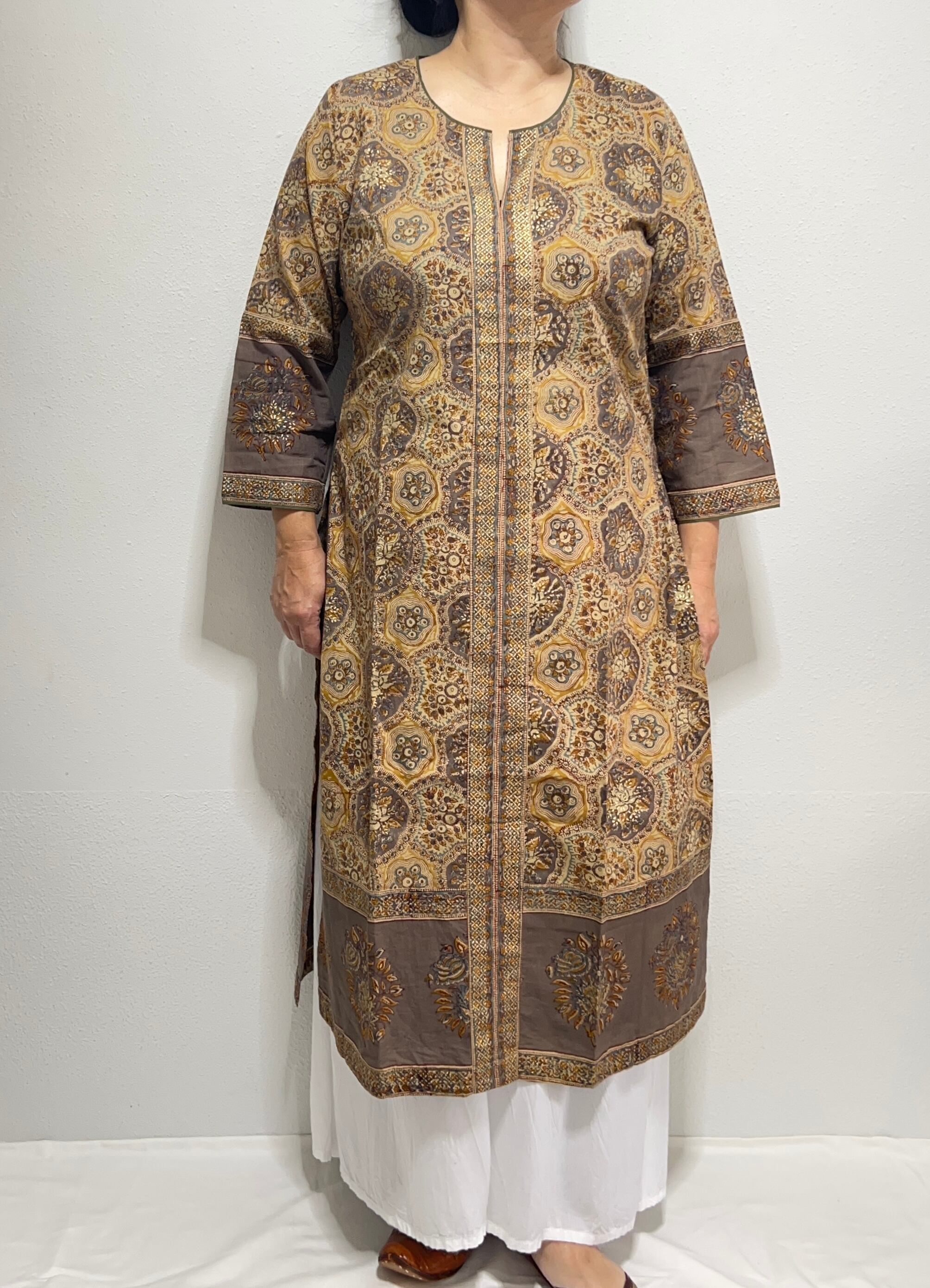 高貴なブラウンゴールドにアラベスク模様と金彩が見事なクルタです。